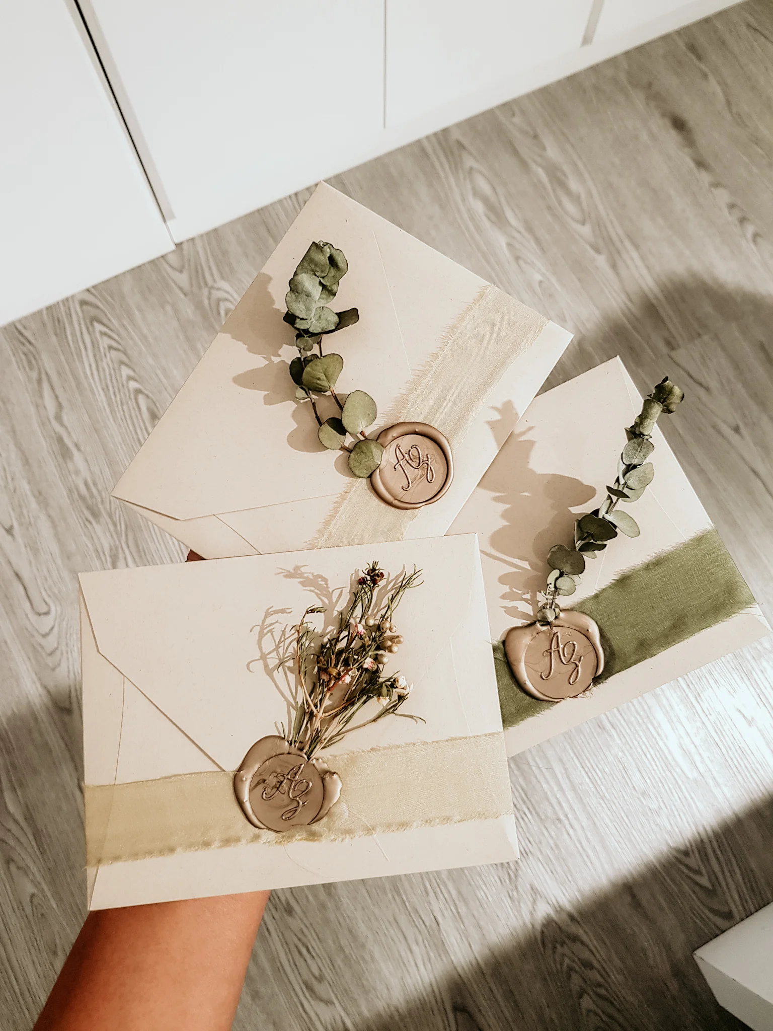 Las ramitas de eucalipto versión mini (perfectas para la invitación), así como todas las flores que ven aquí son de Florenzza. Elegimos dichas “flores” para la invitación porque serían duraderas, en caso de que alguna no pudiera ser entregada a tiempo o que el.